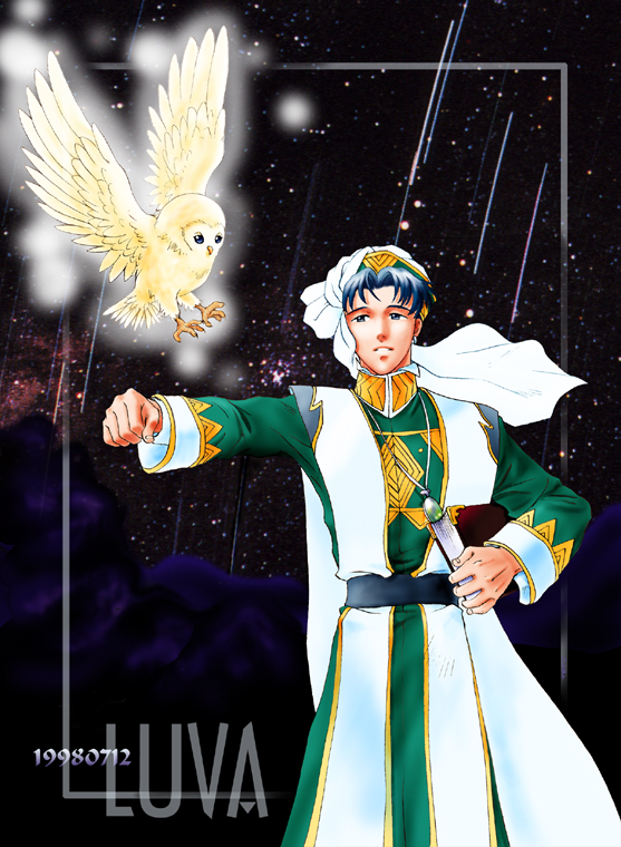 ルヴァ様といえば、釣りなのかも・・・でも、次の「TETU」さんのイラストは、ふくろうさんと一緒にいるよ。 |