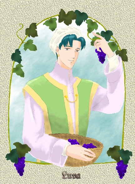ぶどうは「豊穣」・・・つまり、地の恵みの象徴なんです。きっと、私の司る力にかけてくださったんでしょうねー。知恵を感じる、素晴らしいイラストだと思いますよ。 |