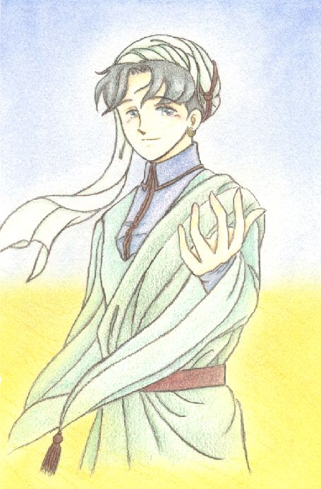 最後は、「けーこ」さんのイラストだよ。このルヴァ様ってば、すごーく優しいお顔してるよね。うしろの風景は砂漠・・・かな? 広々としてて、心がのびのびしちゃう! |