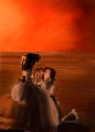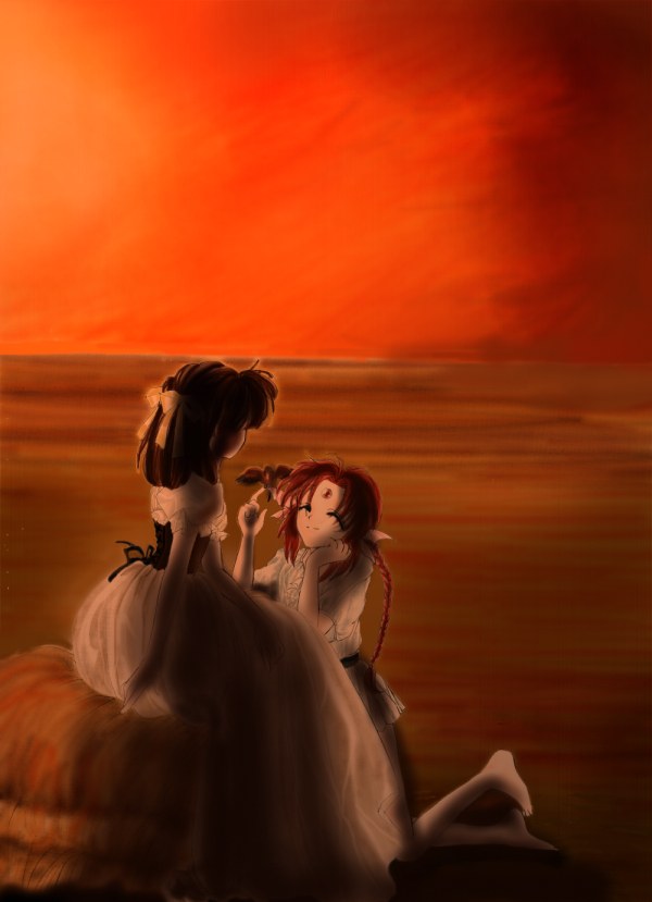 「ローズマリー」さんのイラストは、空気までも赤に染めるような夕焼けが印象的だな。静かな波の音が聴こえてくる気がする…。