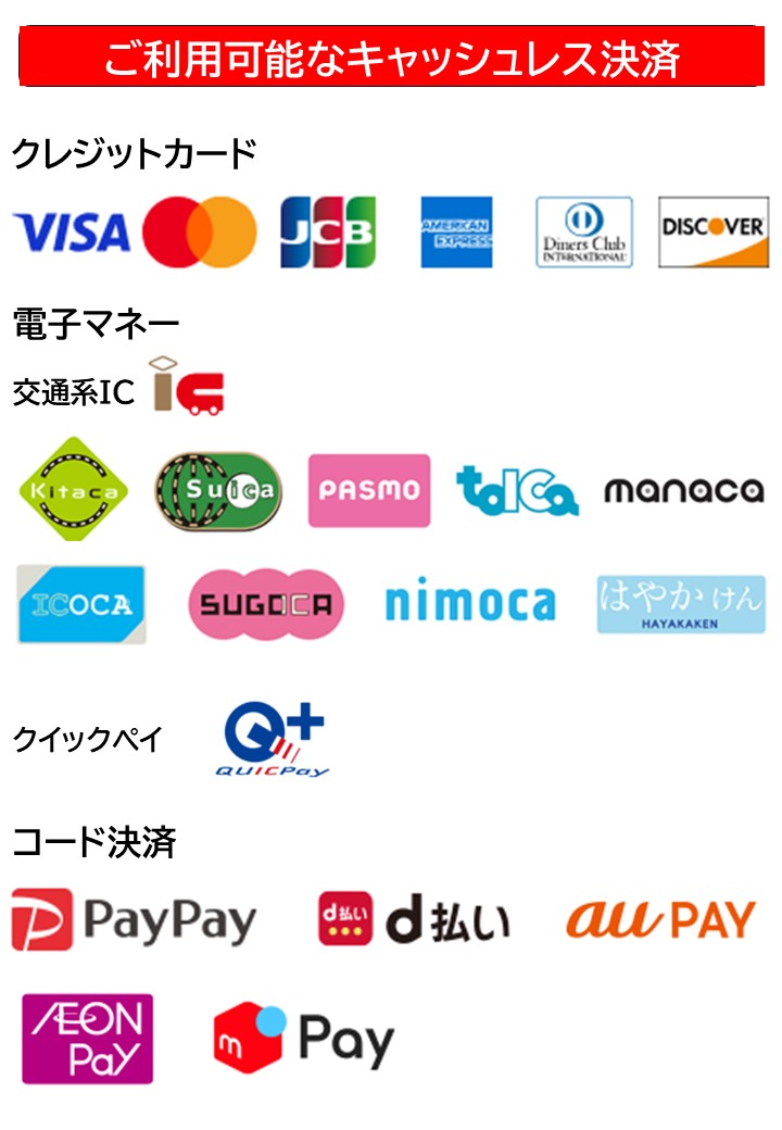 - ※キャッシュレス決済については、上記マークが入っていてもご使用いただけない場合もございます。
