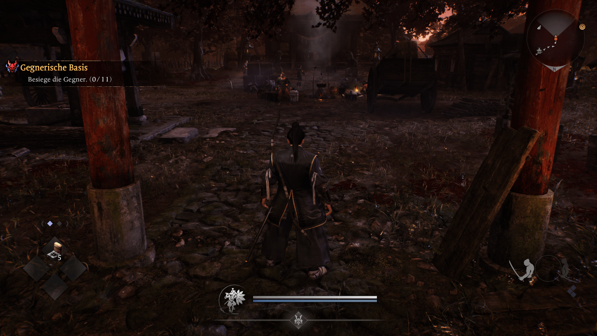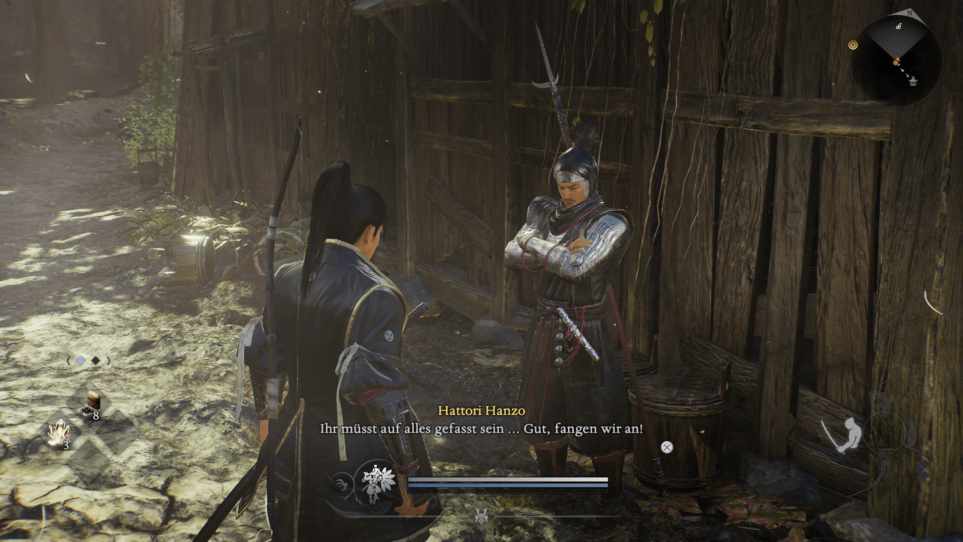 Du kannst Nebenmissionen beginnen, indem du mit NPCs und Shiei, „Todesschatten“, sprichst. Durch den Abschluss von Nebenmissionen erhältst du Ausrüstung, Fähigkeitspunkte und andere Belohnungen.