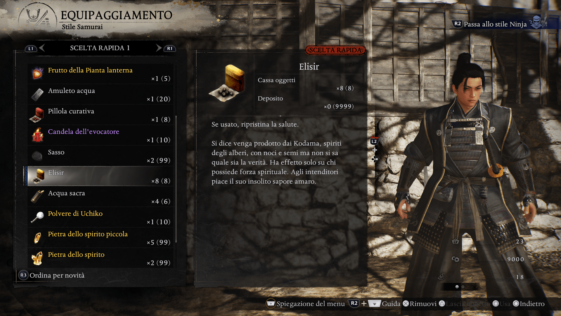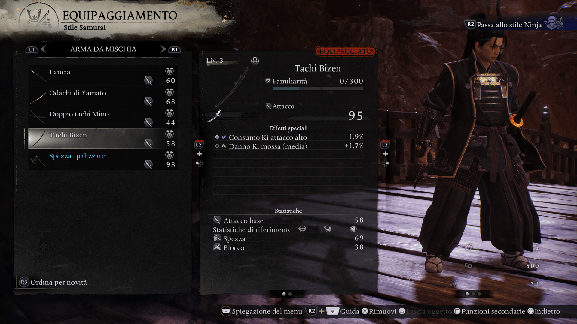 Armi, armature, accessori e Spiriti Guardiani possono essere equipaggiati separatamente negli stili Ninja e Samurai.