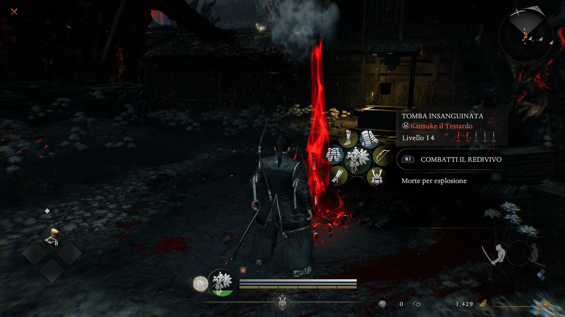 Queste sono le tombe degli altri giocatori, che possono essere utilizzate per evocare e affrontare i Redivivi, ossia giocatori trasformati in Yokai. I Redivivi sono forti, ma se riesci a sconfiggerli potrai ottenere Tazze Ochoko ed equipaggiamento. Inoltre, le Tombe insanguinate registrano la causa di morte dei loro proprietari, un indizio che può rivelarsi utile nella tua missione.