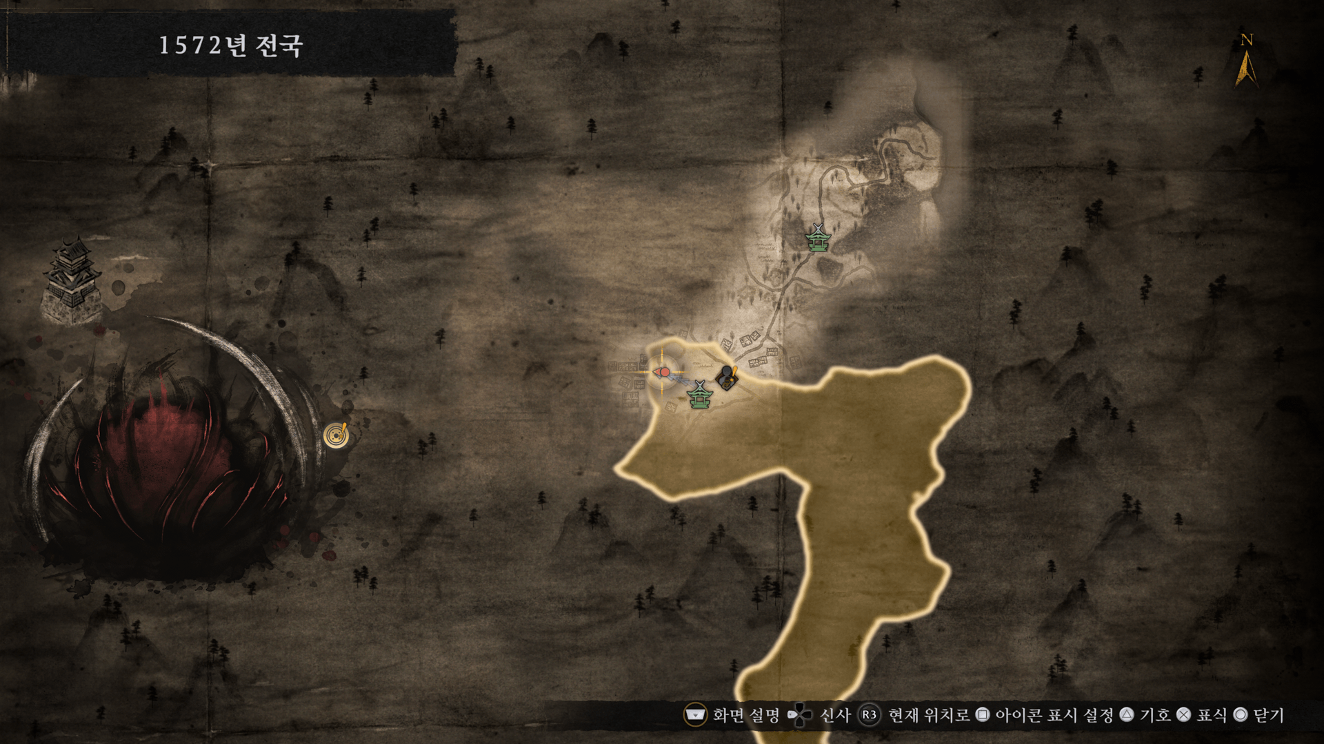 목적지의 방향과 북쪽 방향, 신사 위치 등을 표시합니다.