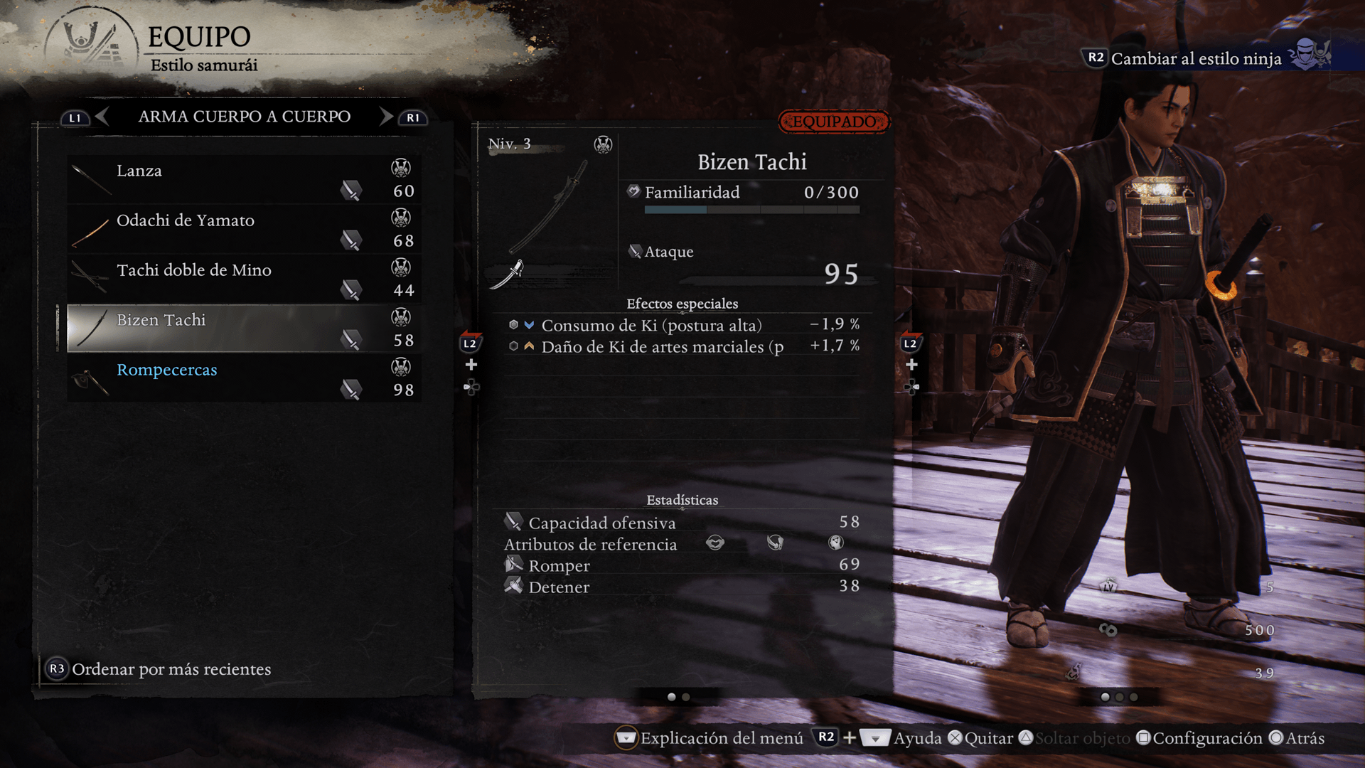 Cada arma tiene valores de ataque únicos, efectos especiales, atributo de romper (la capacidad de quebrar la postura del enemigo) y detener (afecta a la cantidad de Ki que pierdes al bloquear ataques). Además, a medida que utilices un arma, aumentará tu familiaridad con ella. Y, a medida que aumenta la familiaridad, los efectos especiales del arma se potenciarán y aumentará la amrita que recibirás al usarla como ofrenda.