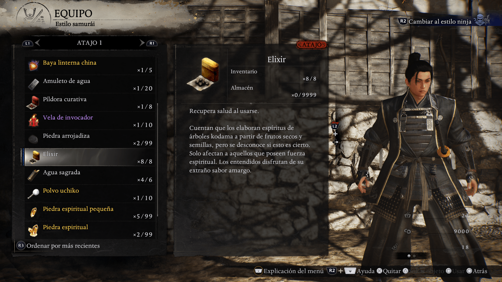 Todas las armas, armaduras, accesorios y espíritus guardianes se pueden equipar por separado entre el estilo samurái y el estilo ninja.