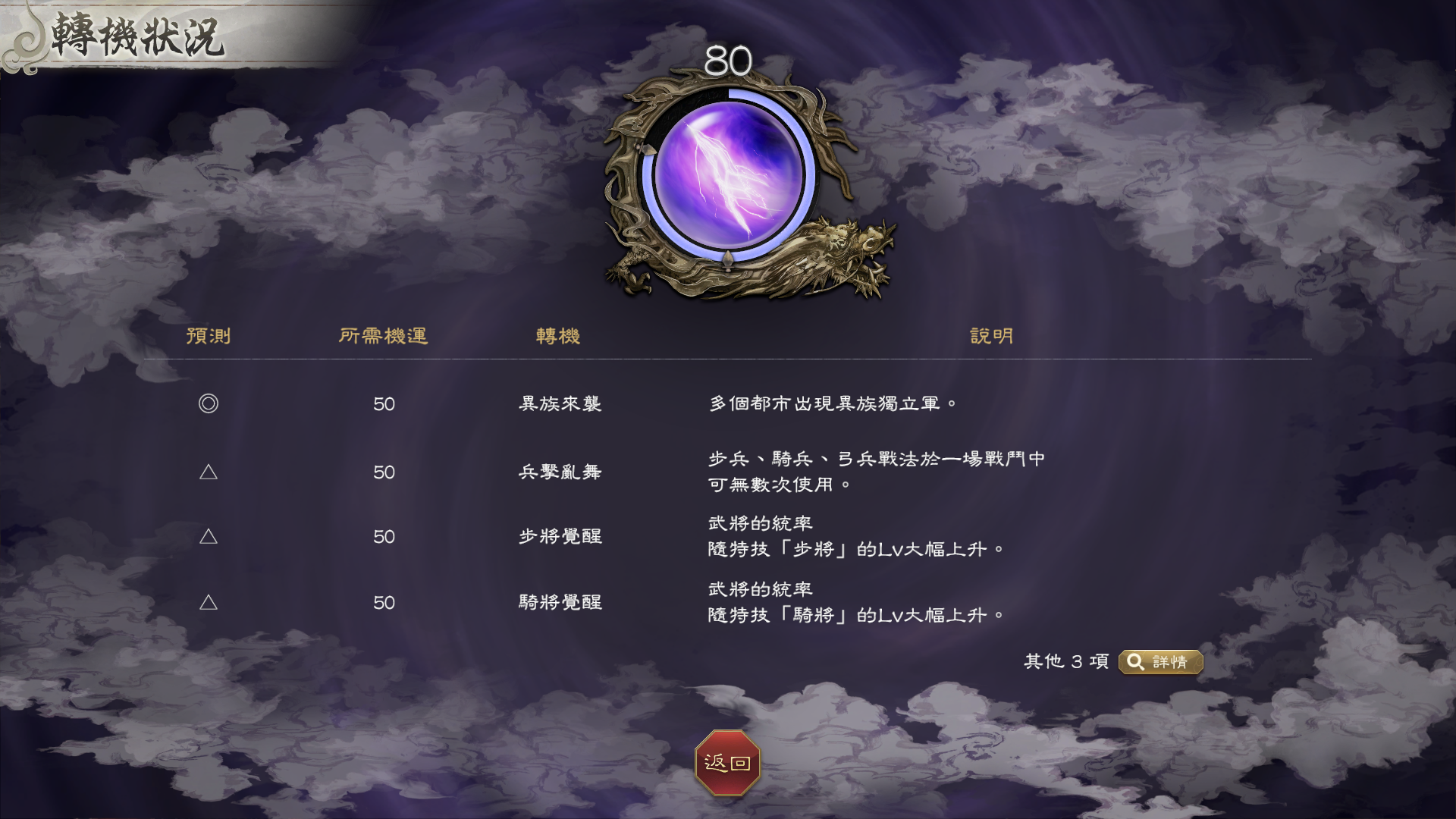 ※在劇本開始時的「劇本設定」中更改「機運自動變動」時,可調整機運變化的速度(轉機發生的頻率)。若將此選項設定為「無」,則基本上不會發生轉機。