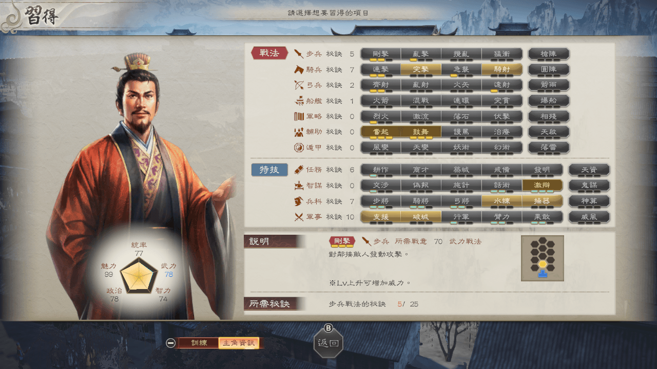 能力可透過訓練提升,特技與戰法則可透過習得獲得。