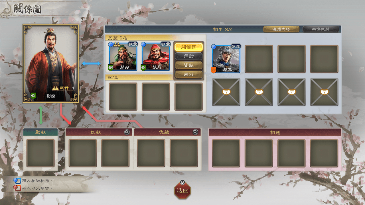 在關係圖中,可以確認與主角有深厚關係的武將。