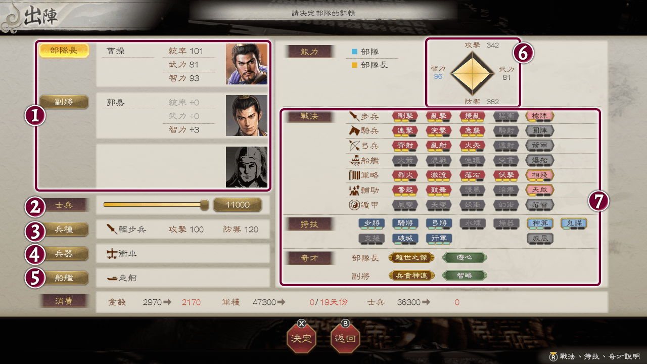部隊的戰法、特技有些會在特定兵種下發揮效果,因此需要特別注意。