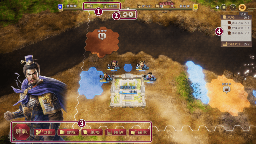 | 陷阱 | 僅防備方可以選擇設置陷阱的位置。 陷阱數量是根據總帥和參軍中智力較高者來決定的。 陷入陷阱的部隊,士兵數量會減少並進入「止步」狀態,無法移動一段時間。 陷阱可以干擾敵軍步調或拖慢其進攻速度,因此應在敵軍可能通過的地點設置陷阱。 |