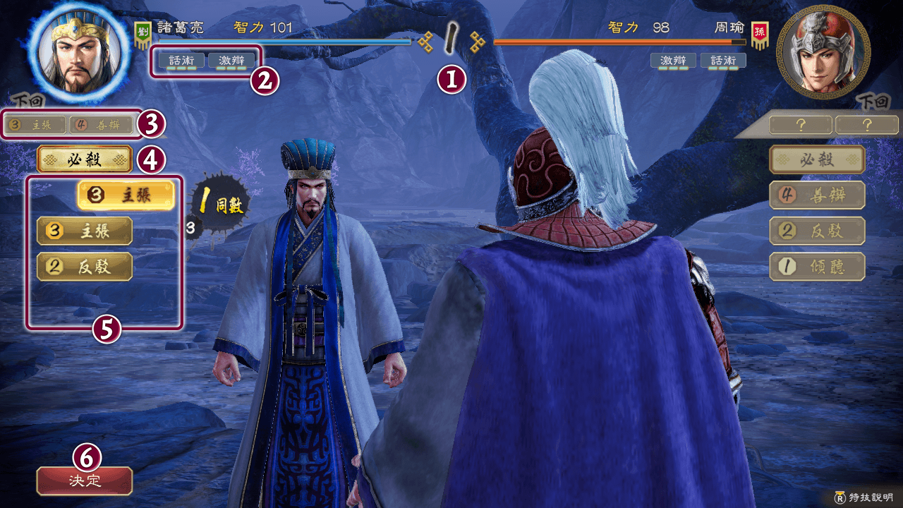 在評定或部分事件中,可能會發生與武將的舌戰。