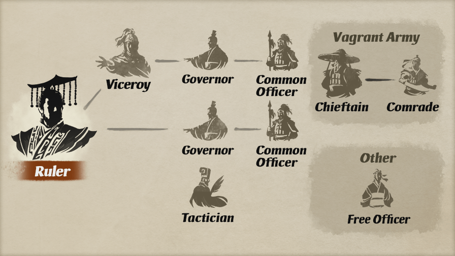 | Comrades | These officers serve the chieftain of a vagrant army. Instead of receiving missions like common officers, they employ new comrades and prepare to raise banners in new territories. |