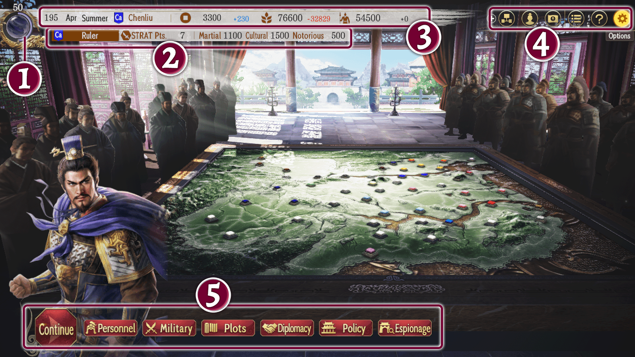 | Plots | Sabotage other forces' cities and officers. If you cannot capture a city with your troops, create an opening with your wits. |