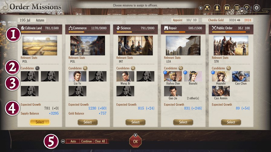 Officers who are given missions will carry out domestic actions on the City screen in order to accomplish them.