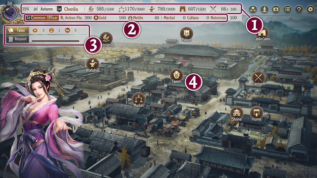 Domestic actions come in five categories: Cultivate Land, Commerce, Science, Repair, and Public Order. These actions are carried out at the farmland, market, workshop, castle gates, and garrison respectively.
