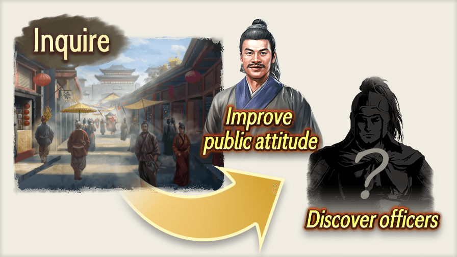 You can conduct inquiries at the farmland, market, workshop, castle gates, and garrison to improve public attitude (your relationship with the citizens).
