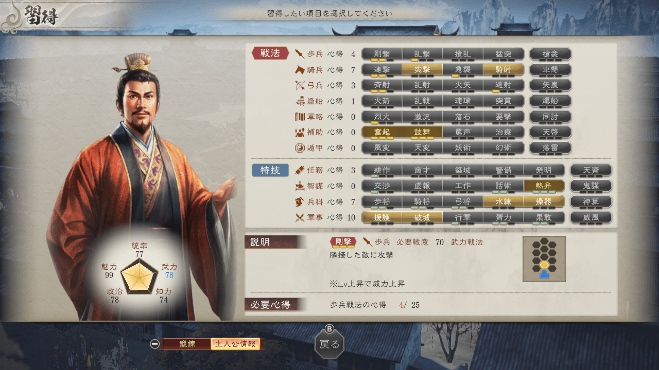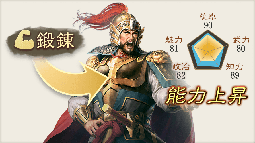能力は鍛錬で上げることができ、特技や戦法は習得で新たに獲得できます。