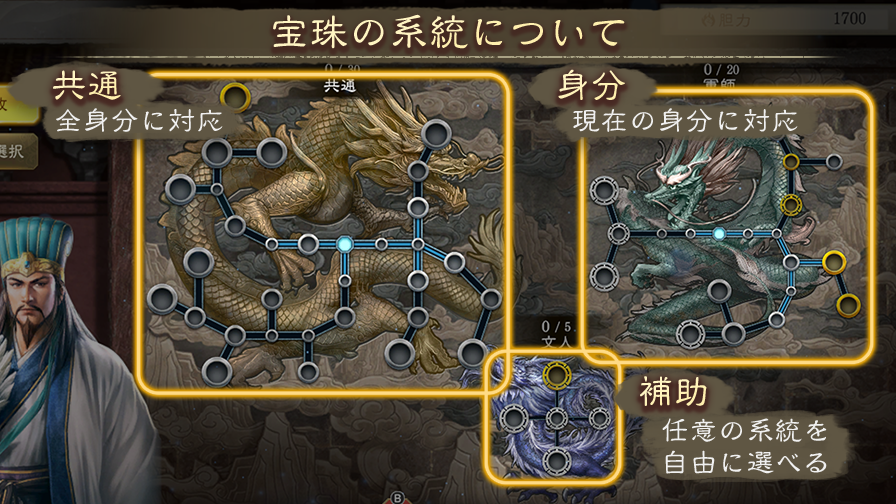 | 補助 | 「補助系統選択」で1つ選び、「補助」に設置できます。「武人」「文人」「悪漢」、または現在とは異なる身分の系統から1つ選べます。君主の身分で「軍師」を選ぶなど。 ※効果を得られるのは、飾り枠の宝珠(最大5個)のみ。 ※一度、補助に設置した系統は3カ月変更できない。 |