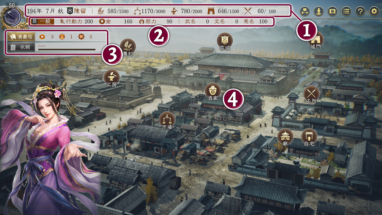 また主人公が所属する都市にある各施設の民心を上げることで、演義伝が発生する場合もあります。