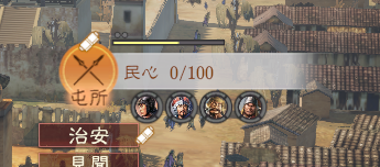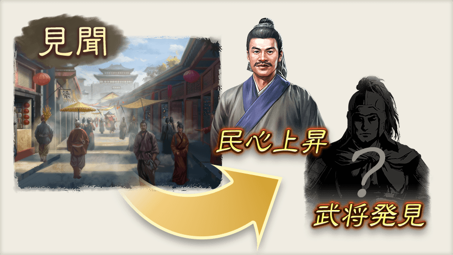 各都市の農村、市場、工房、城門、屯所では見聞を行い、民心(民衆との親しさ)を高められます。