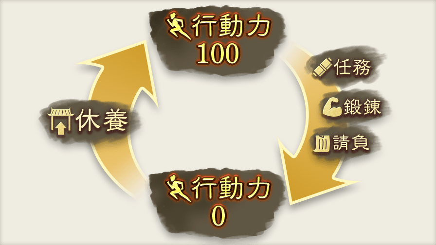 主人公が1カ月の間で使用できる行動力です。一部のコマンドを実行すると消費します。行動力がなくなるまでコマンドを実行できます。行動力がなくなったら、休養して回復しましょう。
