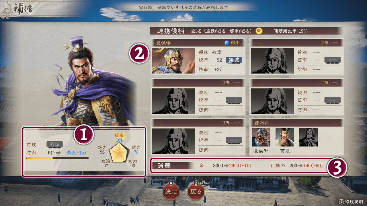 連携候補が多いほど、連携発生率が上がります。連携が発生すると、コマンドの効果や連携武将との親密が上がります。