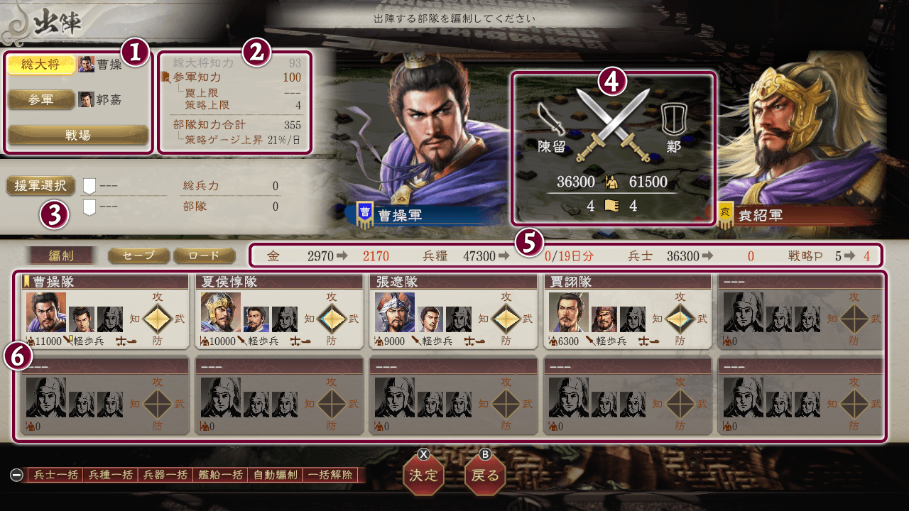 出陣画面では、出陣する武将や部隊の兵種などを決めます。