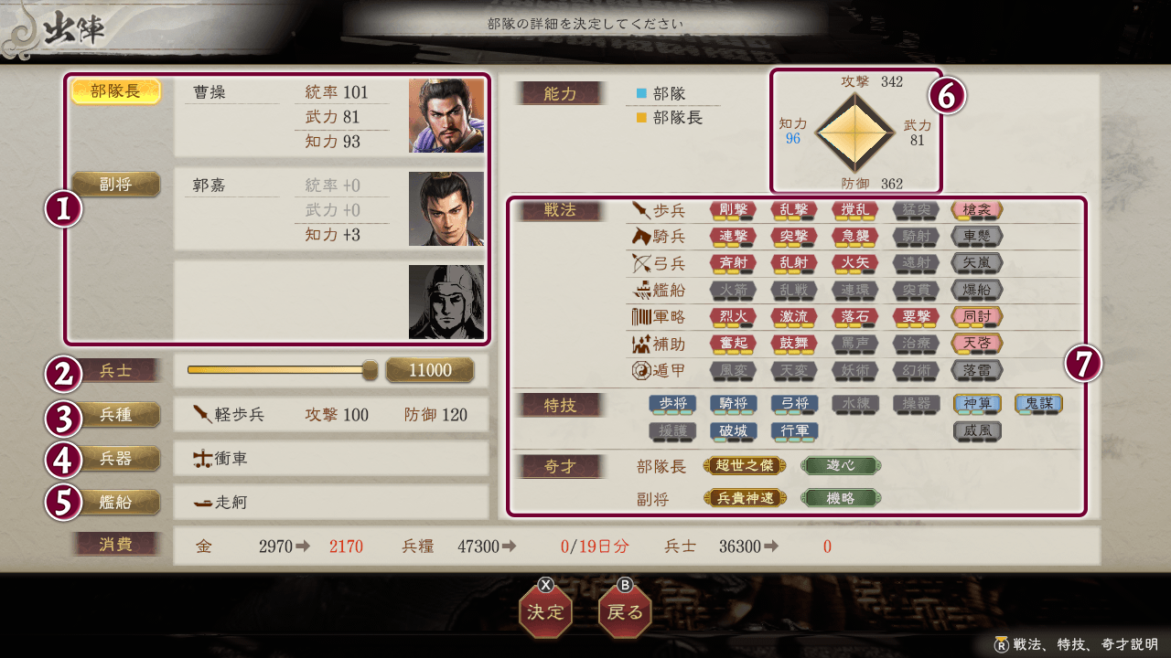 部隊の戦法、特技、奇才は副将のものも適用されます。