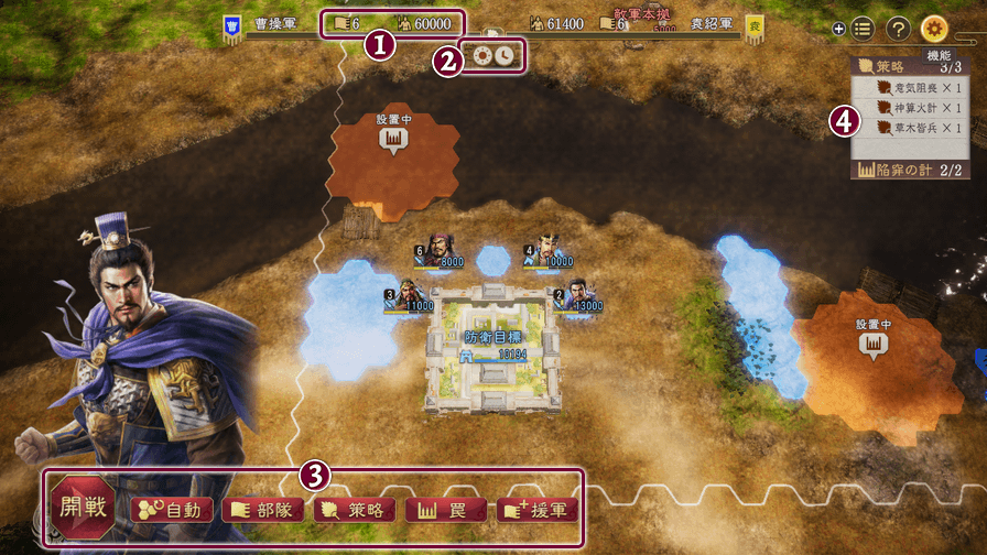| 本拠 | 陥落すると、攻撃側の戦意が下がります。 攻撃側の場合、敵援軍の接近に備えて、本拠を守る部隊を残しましょう。 |