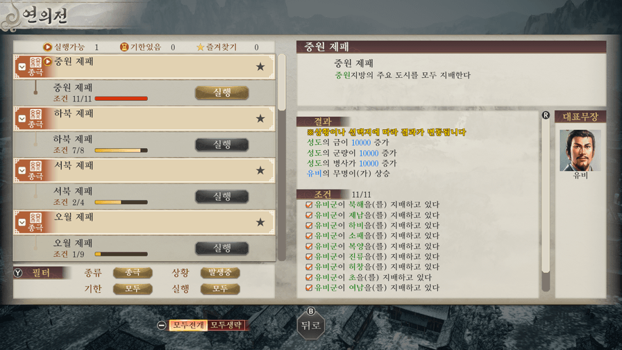 | 역사적 사건 | 사실과 연의에서 유명한 사건은 연의전을 실행하면 발생합니다. 세력의 상황이 크게 변화하는 경우도 있으니 주의하도록 합시다. |