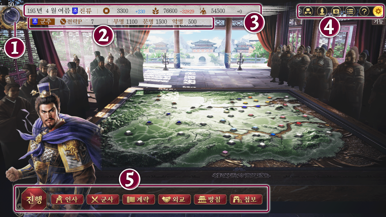 | 군사 | 징병하거나 다른 도시를 공격합니다. 병사를 많이 양성해 다른 도시를 공략하는 것이 천하통일을 향한 기본적인 흐름입니다. |