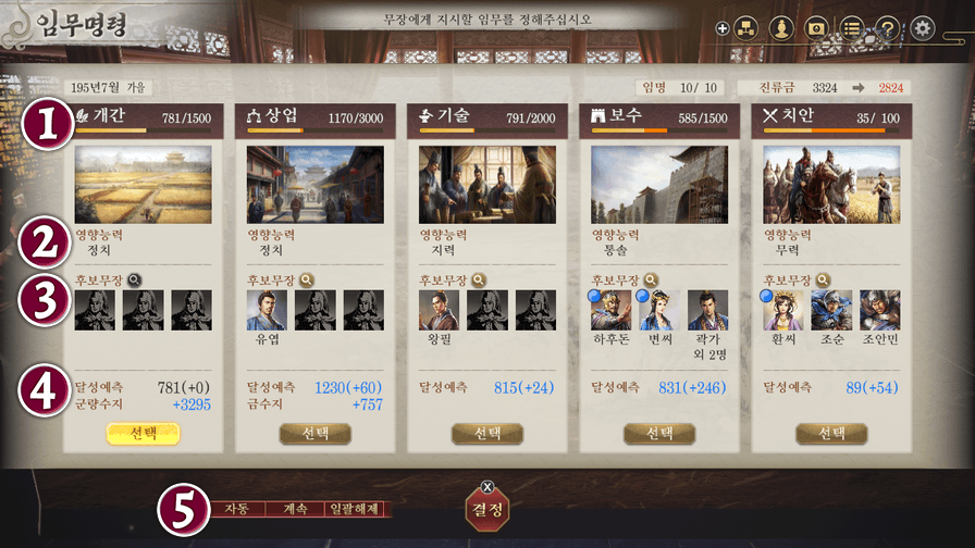 내정 커맨드는 개간, 상업, 기술, 보수, 치안 5종류가 있습니다.