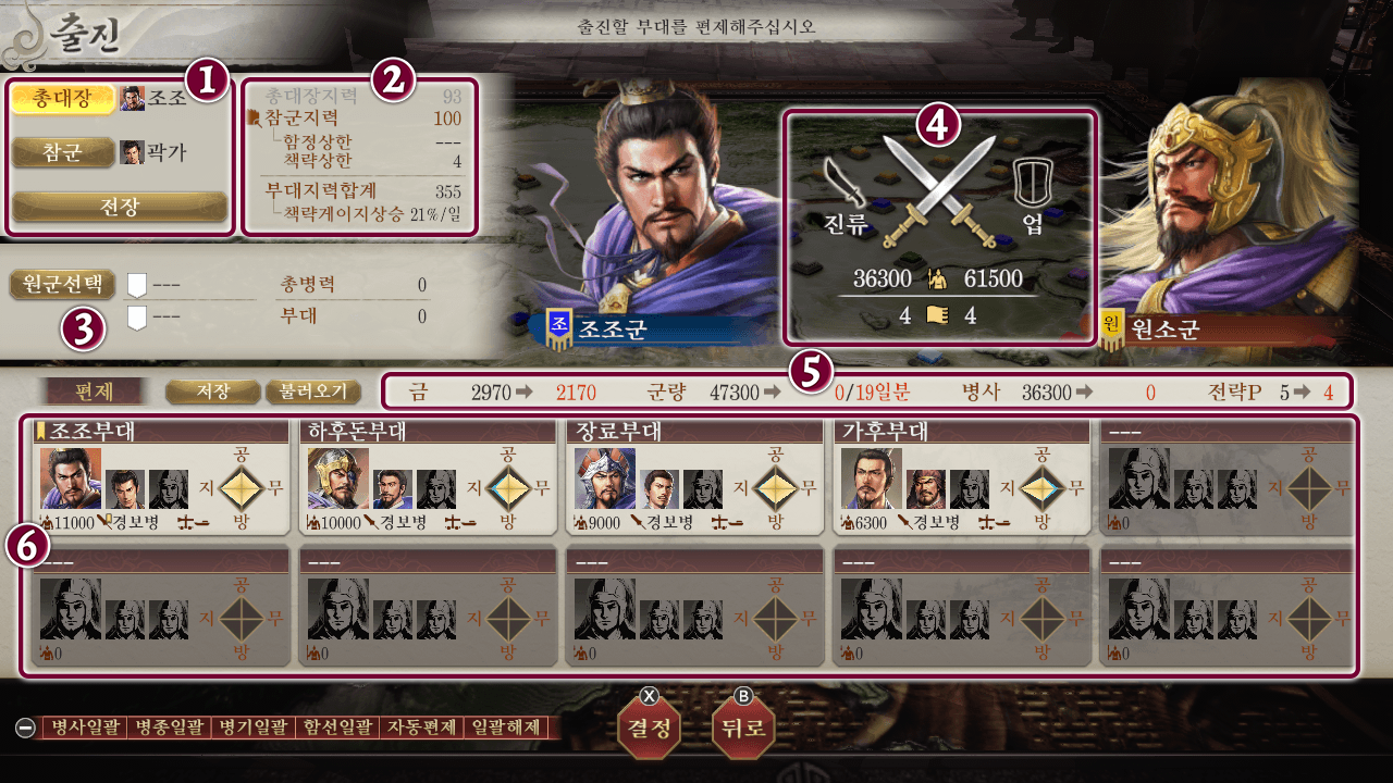 부대장의 계급이 높을수록 편제할 수 있는 병사의 수가 많아집니다. 병사 수가 많으면 군량의 소비가 많아집니다.