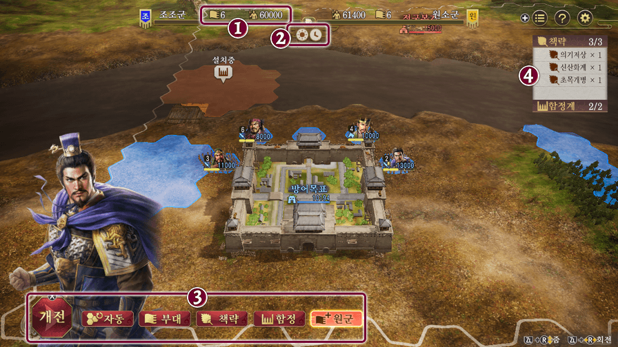 총대장 또는 참군의 지력이 높은 쪽을 기준으로 가져갈 수 있는 책략의 수, 함정의 설치 수가 정해집니다.