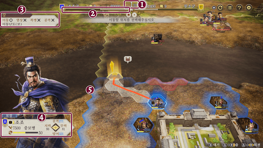 | 동지 | 총대장일 경우에는 방랑군을 조작할 수 있습니다. 총대장이 아닐 경우에는 주인공의 부대만을 조작할 수 있습니다. |