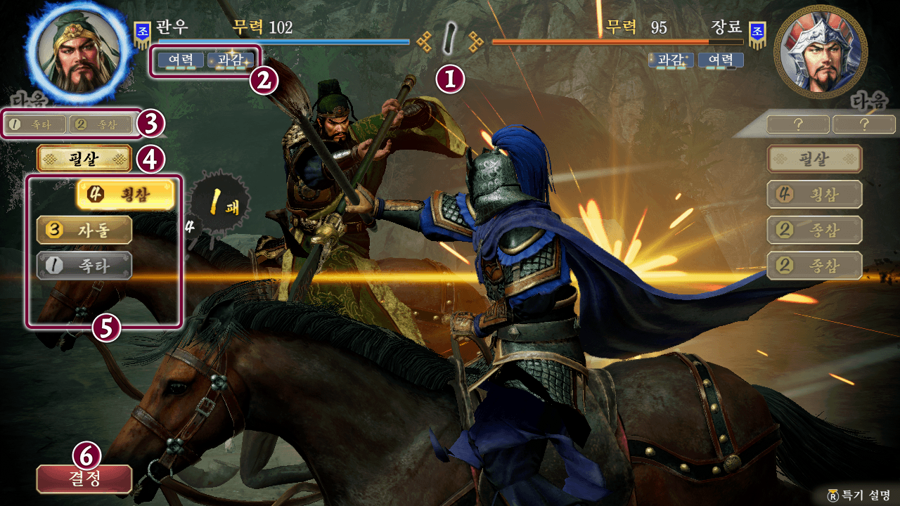 무력의 차이가 너무 클 경우, 무력이 낮은 무장의 체력이 일격에 0이 될 수 있습니다.