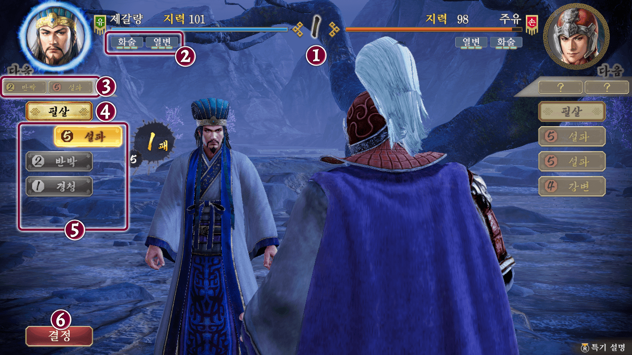 설전 시작 시, 지력이 높은 무장이 상대에게 일격을 가합니다. 그 후, 패 승부가 시작됩니다.
