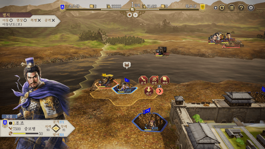 | 전법 | 부대의 무장이 소지 중인 전법을 발동합니다. 전법은 공격, 회복 등 다양한 효과가 있으며 각각 한 번만 발동할 수 있습니다. 전법은 각각 전의가 일정 이상일 때 발동할 수 있습니다. |