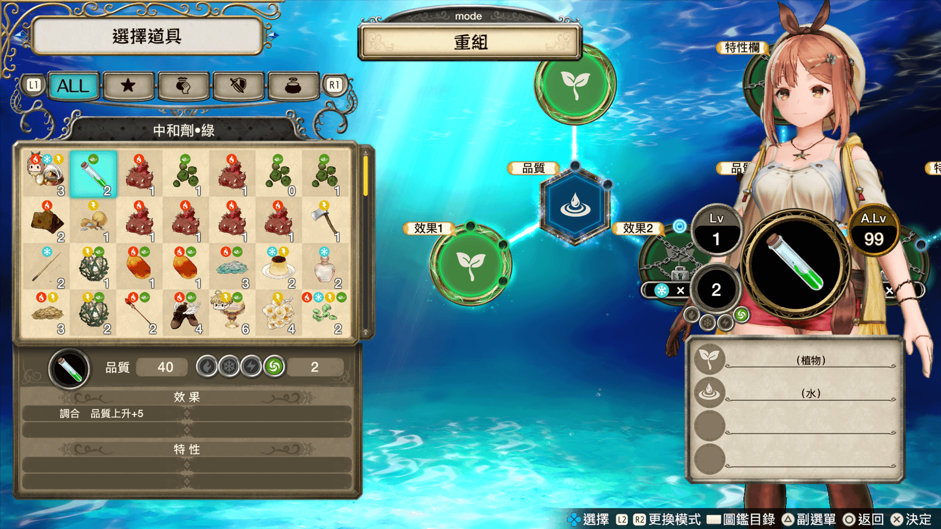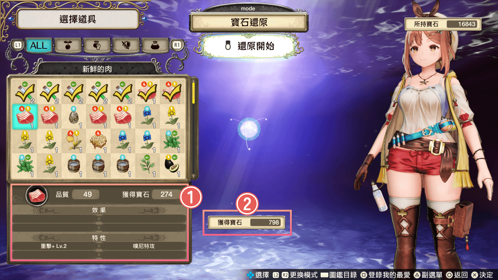 帶回鍊金工房等處的道具當中,若有不需要的道具(例如品質偏低或數量過多),可以將其自動還原為寶石。
