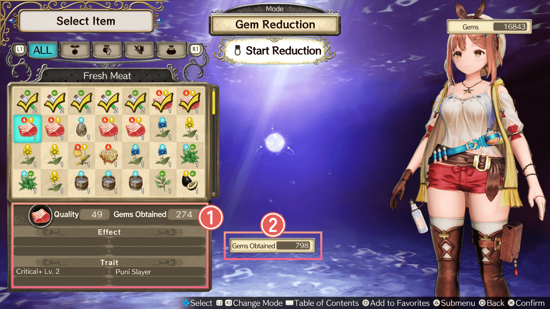Items brought back to the atelier and deemed unnecessary, such as those of low quality or in excess quantity, can be automatically converted into Gems.
