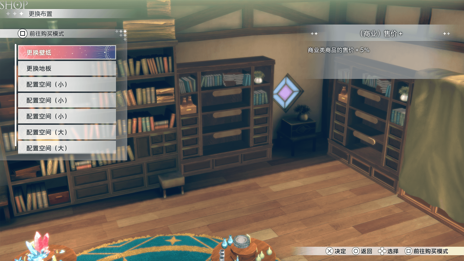与鲁库鲁对话后,可以购买墙壁、地板、摆设等物件,自由改变商店的装潢。
