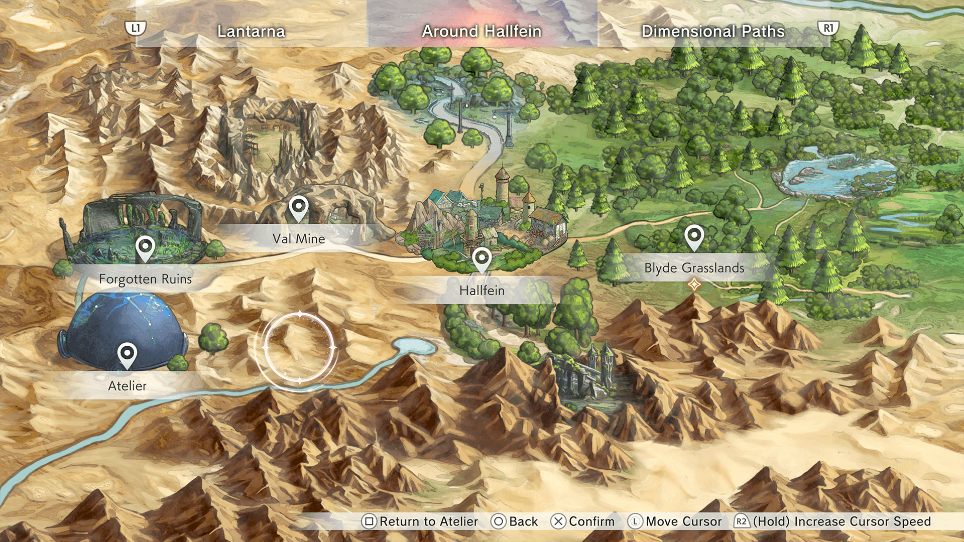 The area map is divided into three different sections: "Lantarna," "Around Hallfein," and "Dimensional Paths."