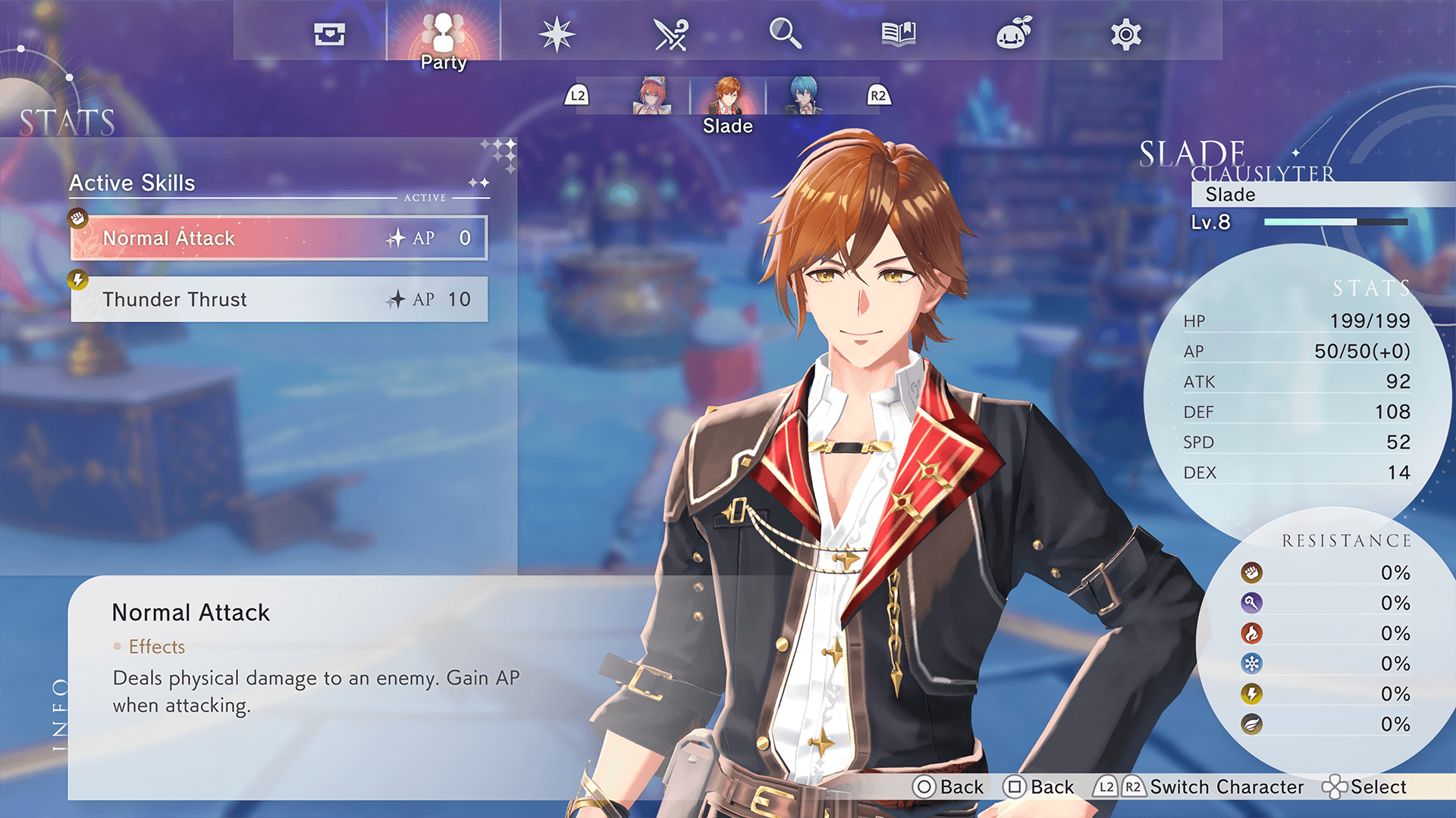 You can change your party's formation and check characters' stats from this screen.