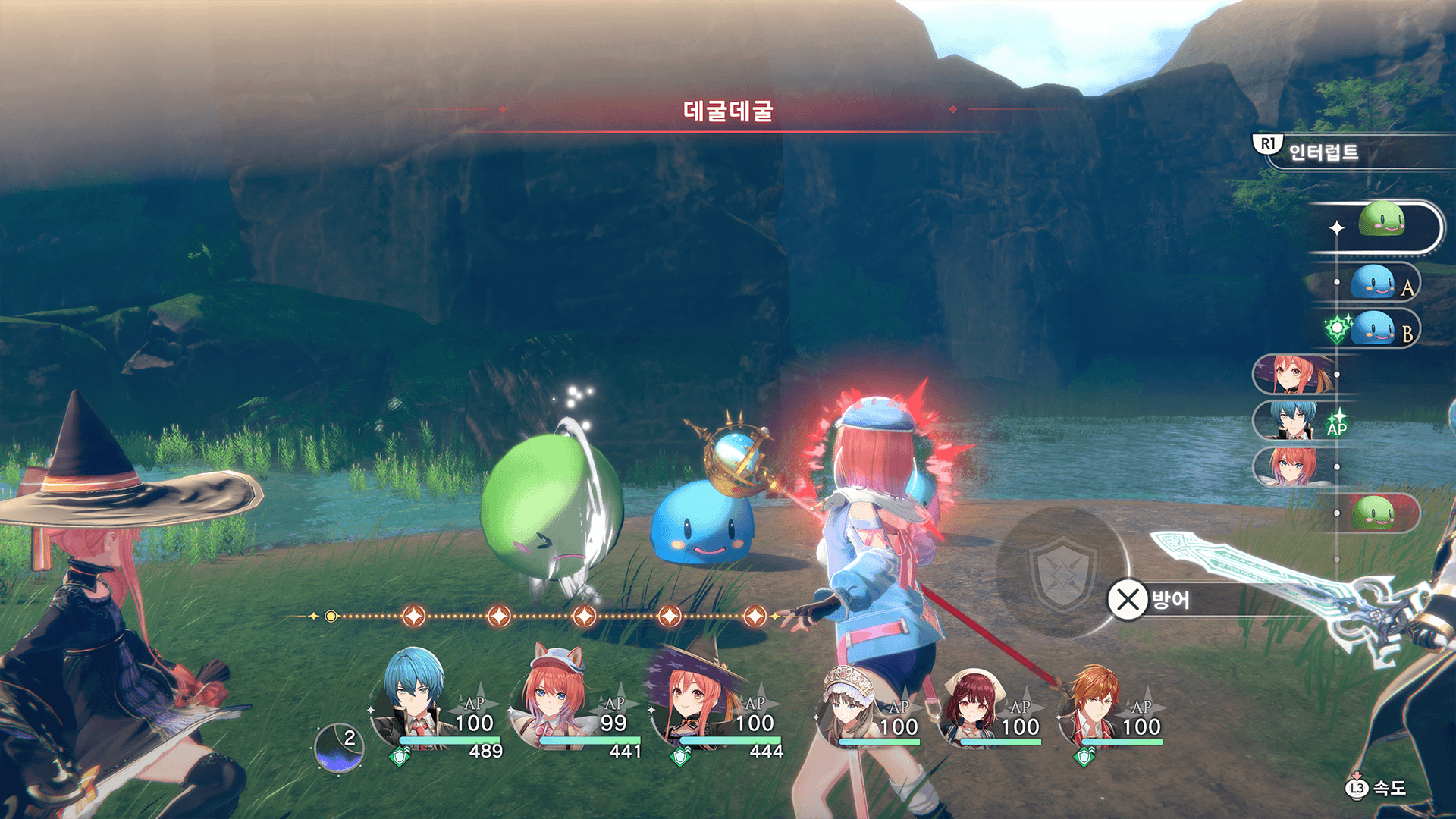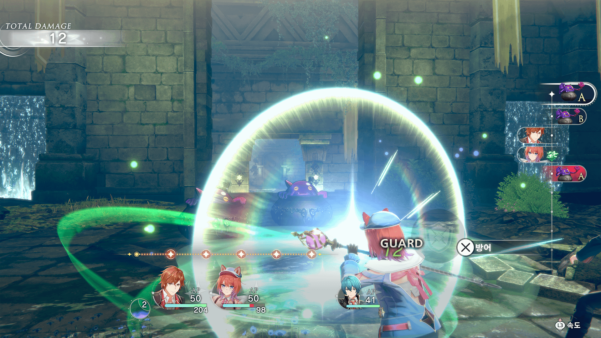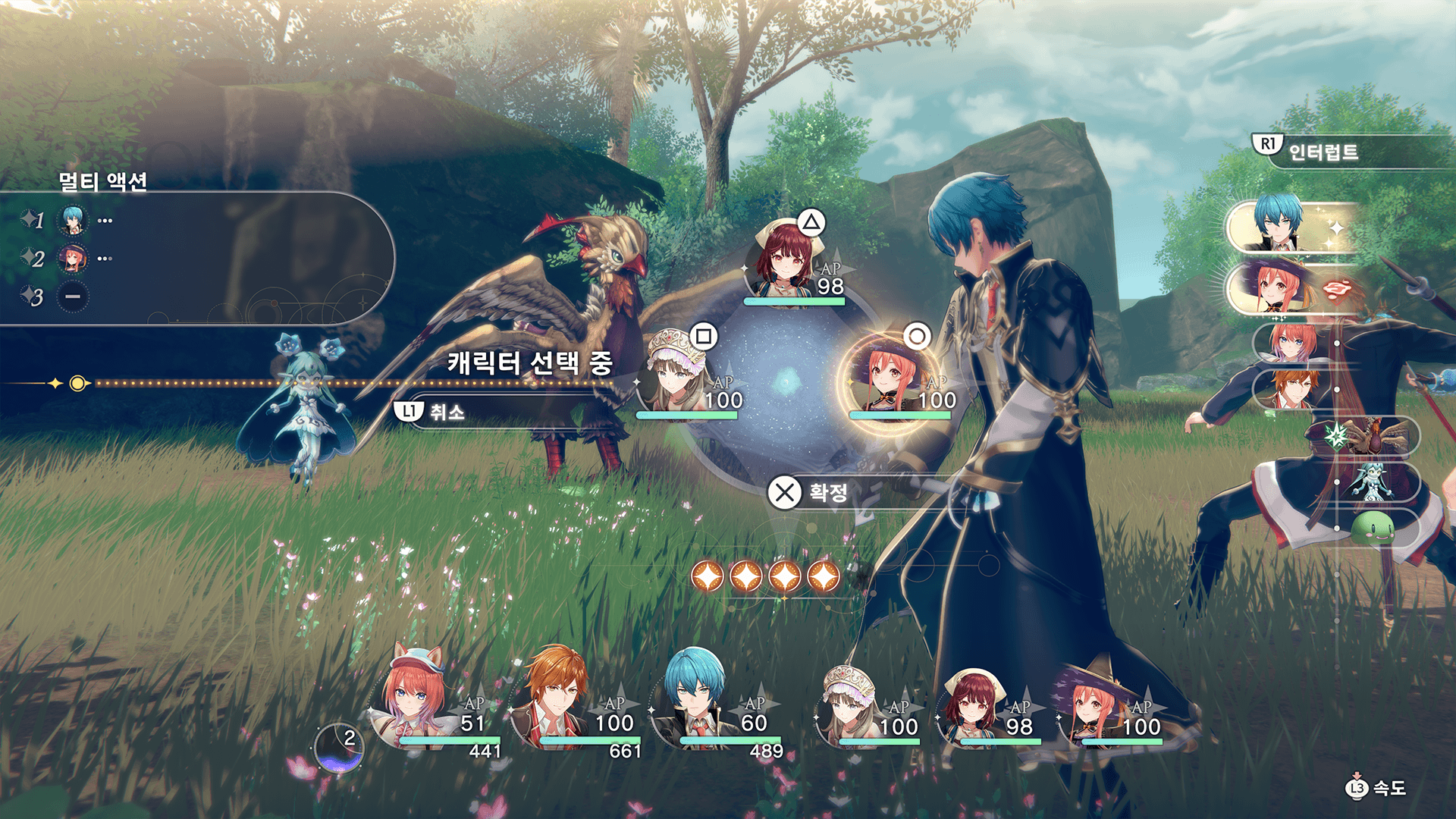 배틀 커맨드 선택 시 TP를 사용하여 차례가 된 캐릭터의 뒤에 후열 멤버의 차례를 추가할 수 있습니다.