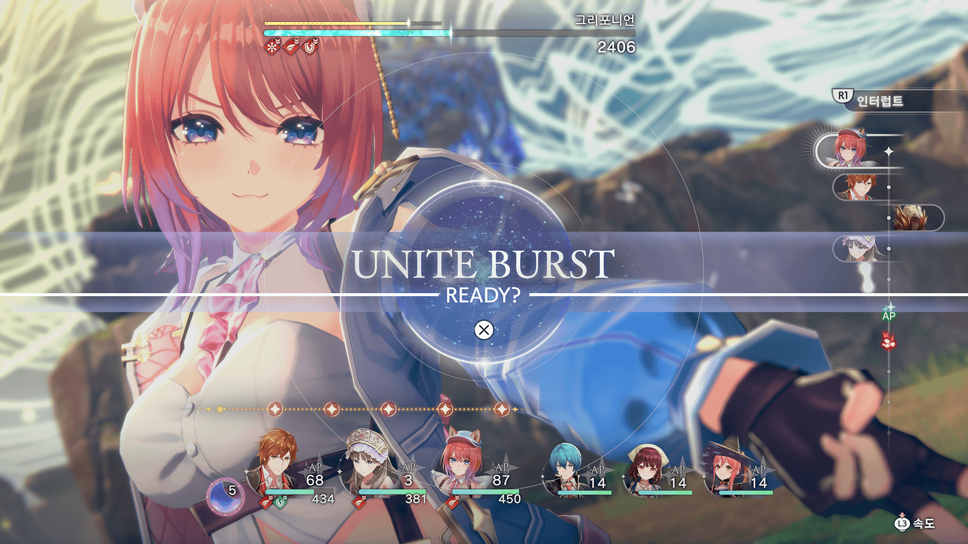 유나이트 게이지가 5일 때, 배틀 커맨드 선택 시에 아래의 버튼을 누르면 유나이트 버스트를 발동할 수 있습니다.