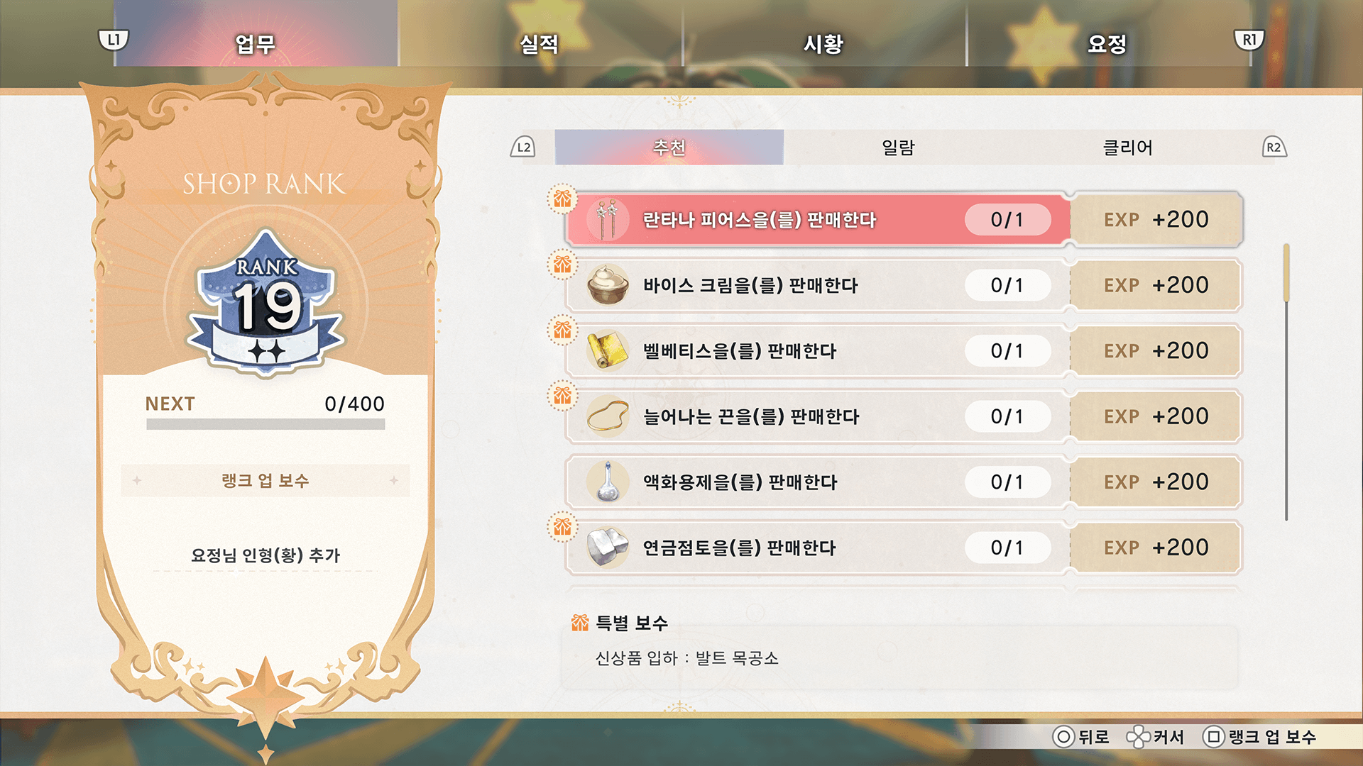 구입 가능한 아이템은 업무를 수행하고 상점 랭크를 올리면 늘어납니다.