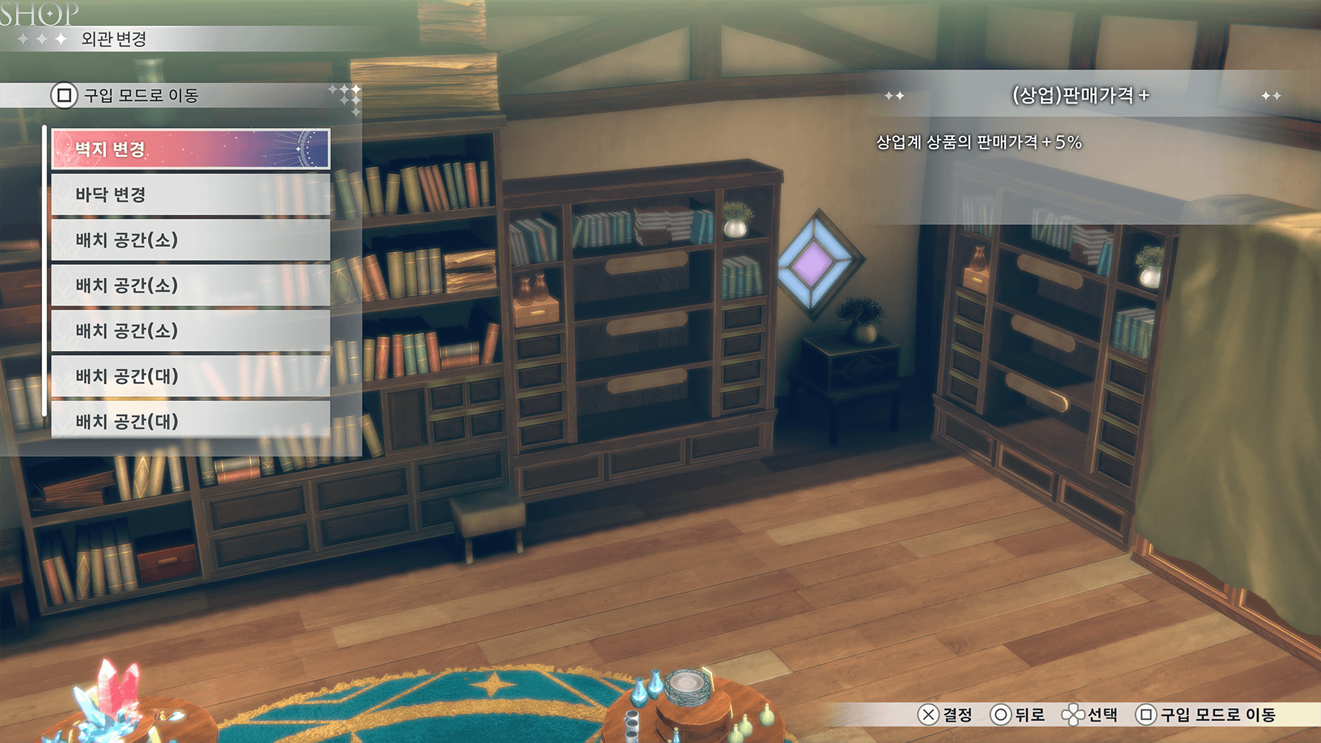 루클에게 말을 걸면 벽이나 바닥, 배치물 등을 구입하고 가게의 인테리어를 변경할 수 있습니다.