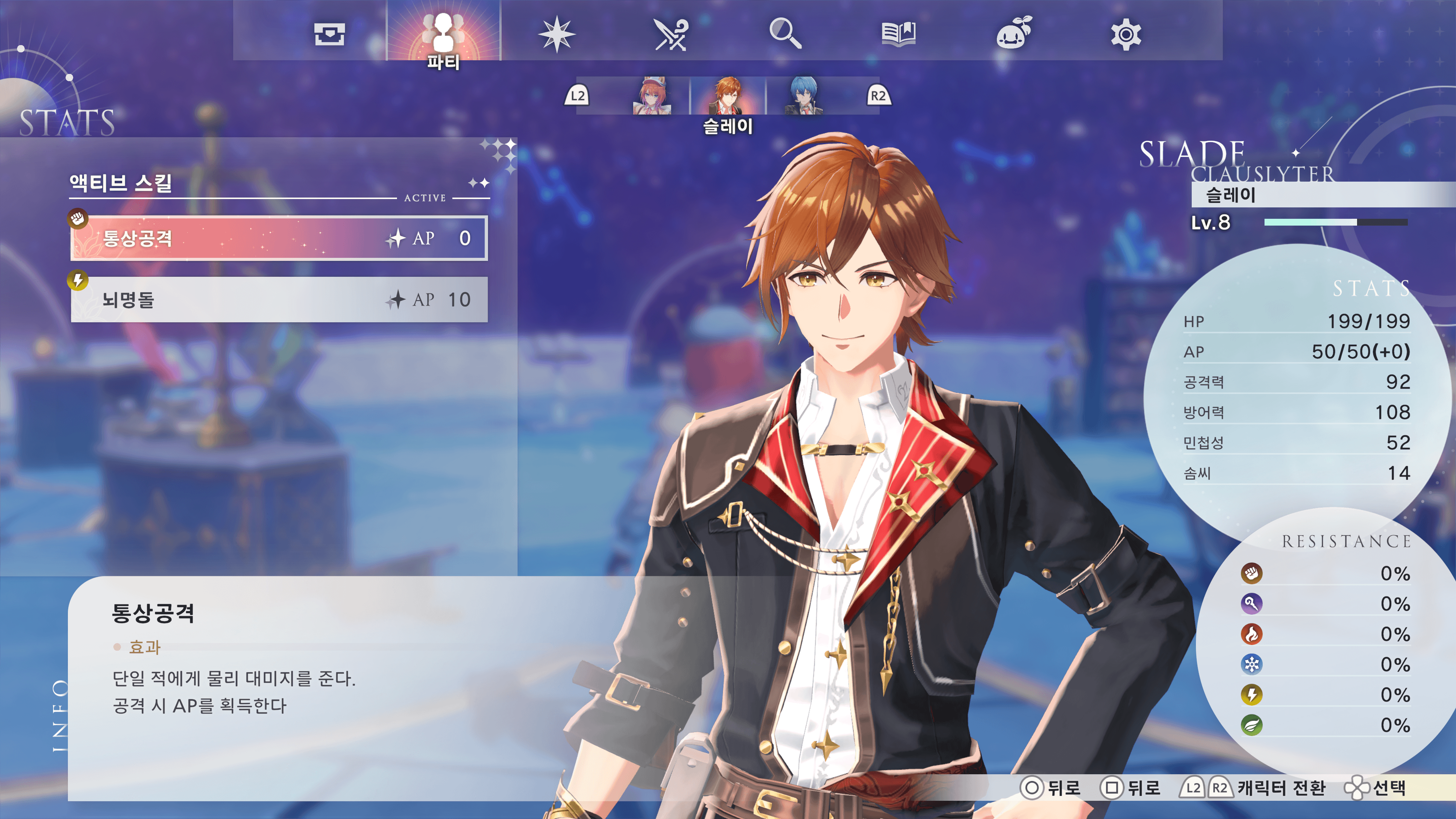 파티 멤버의 편성을 변경하거나 스테이터스를 확인할 수 있습니다.